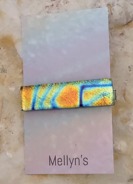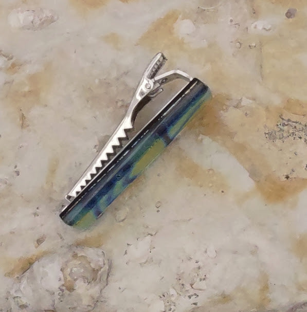 Add style to your tie. This tie clip is made of Dichroic Glass and affixed to a rhodium plated clip. The tie clips measure 2 x 1/2. The glass is hand cut then fused. All my creations are fired at temperatures up to 1500 degrees and then annealed (slowly cooled) for strength and durability. Dichroic glass, is glass that appears different colors depending on the light source and the viewer's position. Would make a excellent gift. All clips come with a gift box ready to give.