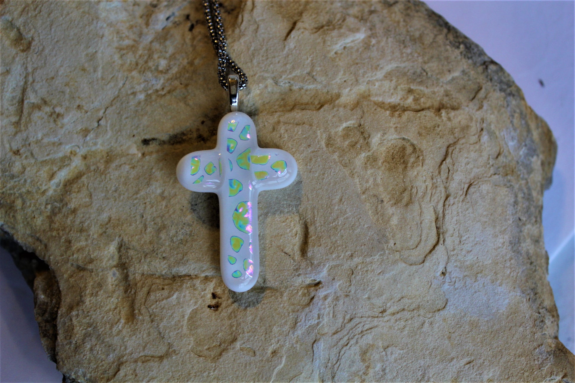This stunning White Cross pendant is made with dichroic glass. The cross measures 2 inch high with bail. The glass is layered on a black base and the main colors of dichroic glass placed on top. I fire at temperatures up to about 1500 degrees and then annealed (slowly cooled) for strength and durability. This pendent comes with a stainless steel chain. Finished with silver plated lobster clasp.
